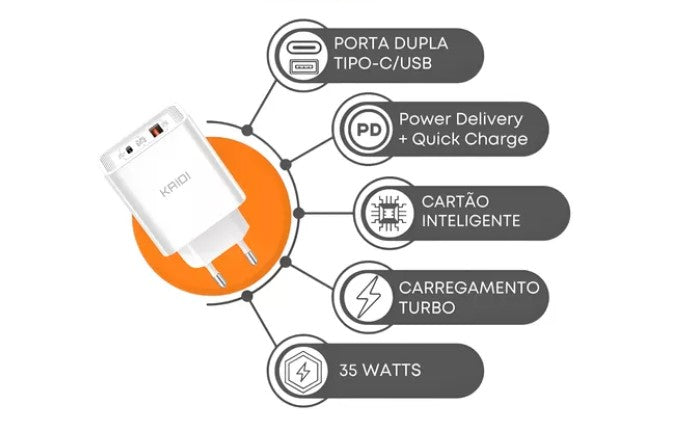 Fonte Carregador Turbo 35w Entrada Usb+Tipo-c Kaidi KD-671C